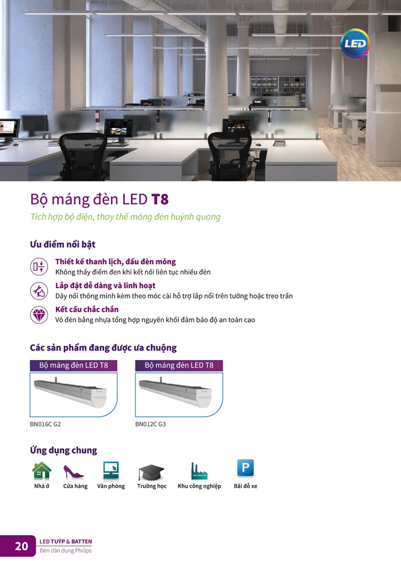 - Đèn LED thanh ray Philips: Sản phẩm này thích hợp cho việc chiếu sáng khu vực lớn, như siêu thị hay nhà xưởng, với khả năng tăng cường ánh sáng hiệu quả.