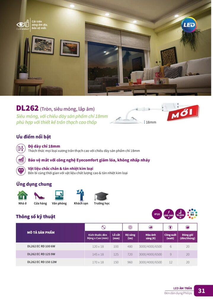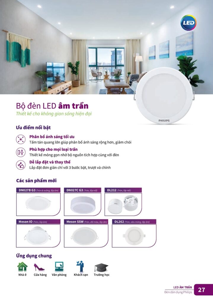 - Đèn LED downlight Philips: Phổ biến trong việc chiếu sáng văn phòng, cửa hàng và nhà hàng, đèn downlight Philips mang lại ánh sáng tỏa đều và hiệu quả.