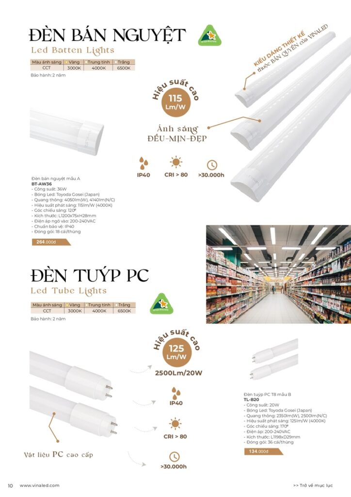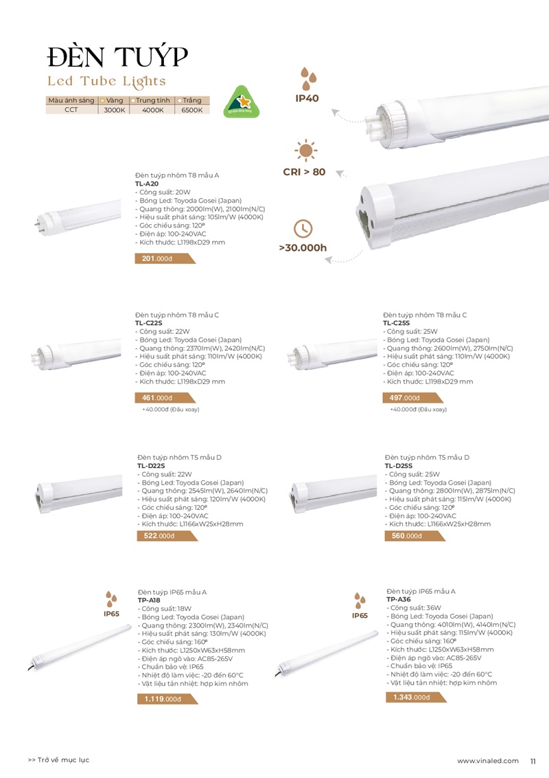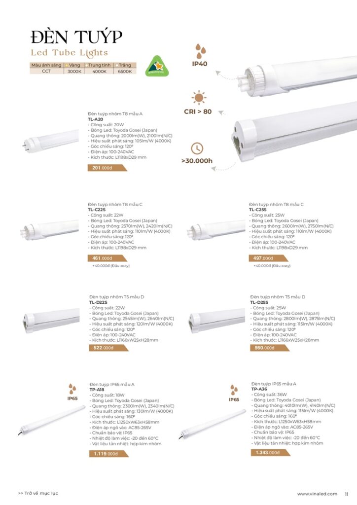 - Đèn Tuýp VinaLED: Thay thế đèn huỳnh quang, sử dụng led driver bảo vệ.