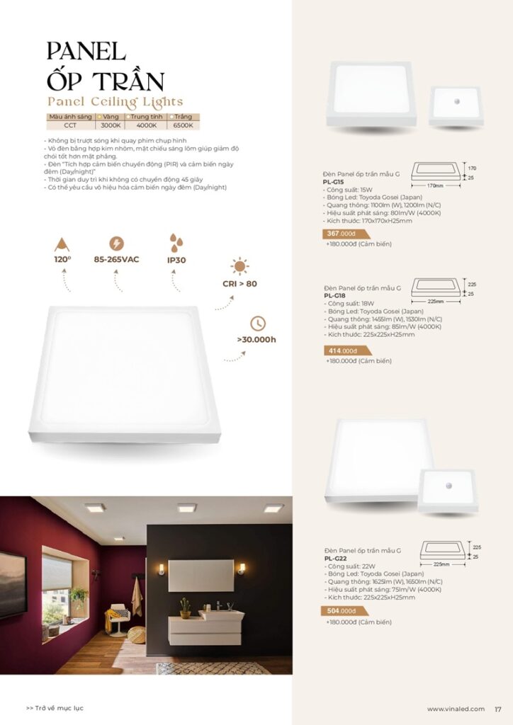 - Đèn Panel Ốp Trần: Góc chiếu 120°, công suất từ 8W đến 30W.