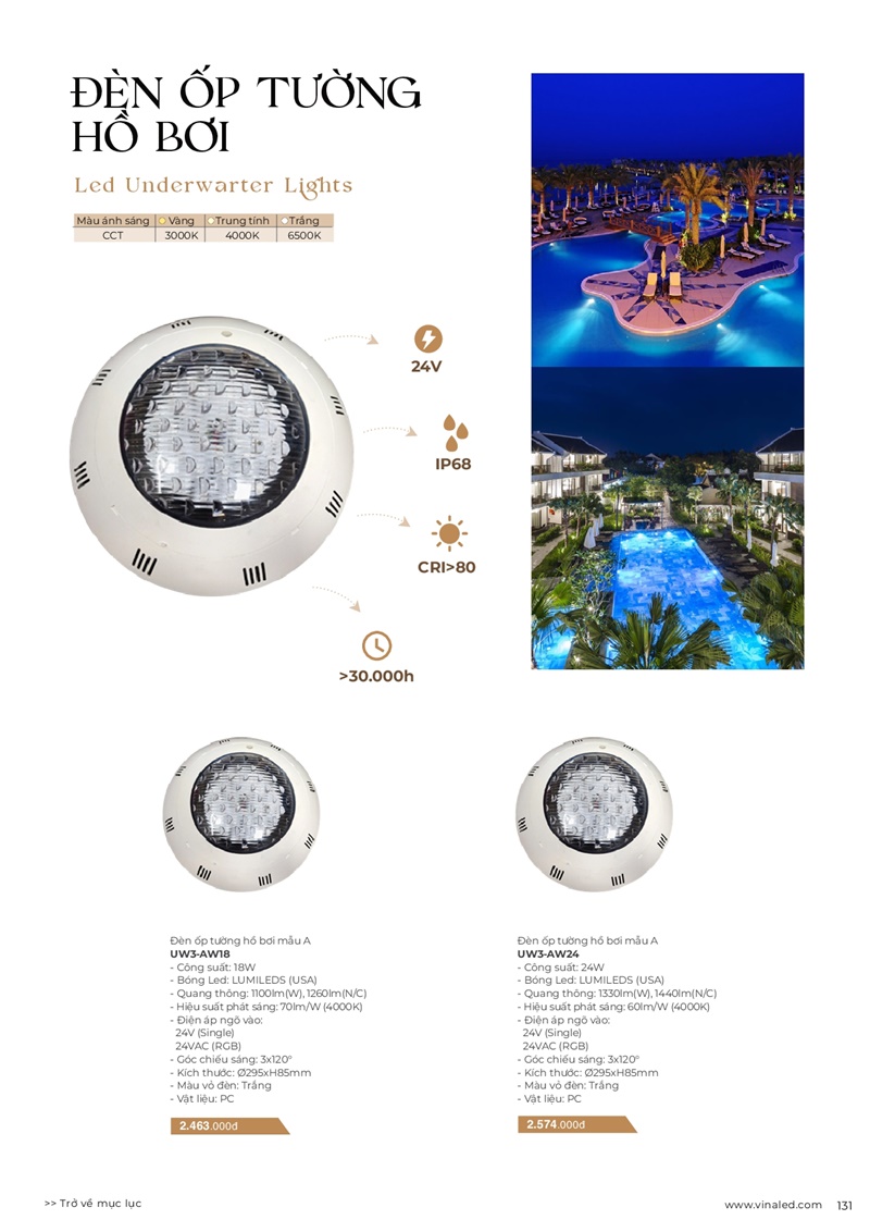 - Đèn Dưới Nước: Thiết kế chống nước IP68, phù hợp cho đài phun nước và hồ bơi.