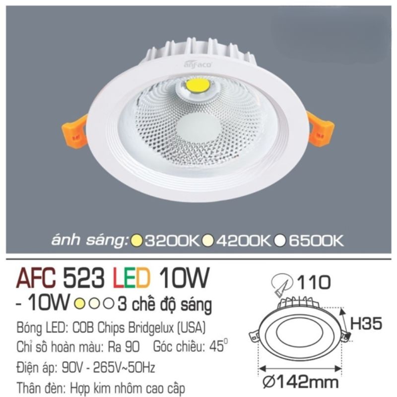 Dưới đây là các thông số kỹ thuật ấn tượng giúp AFC 523 LED 10W khẳng định vị thế trong dòng sản phẩm đèn downlight cao cấp: