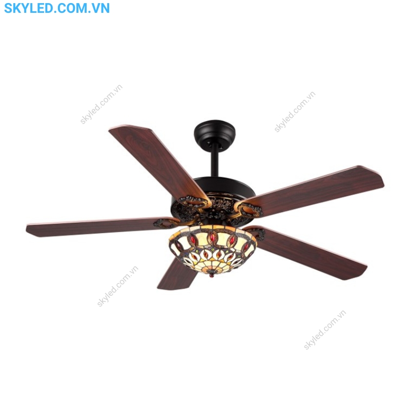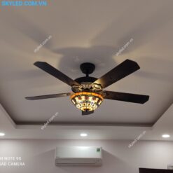 Đèn còn kết hợp với cánh quạt làm từ gỗ tự nhiên và nhựa ABS chất lượng cao, giúp sản phẩm không chỉ bền bỉ mà còn nhẹ nhàng và dễ dàng di chuyển. Chao đèn thường được thiết kế bằng chất liệu pha lê hoặc thủy tinh cổ điển, tạo nên vẻ đẹp sang trọng và quý phái.