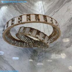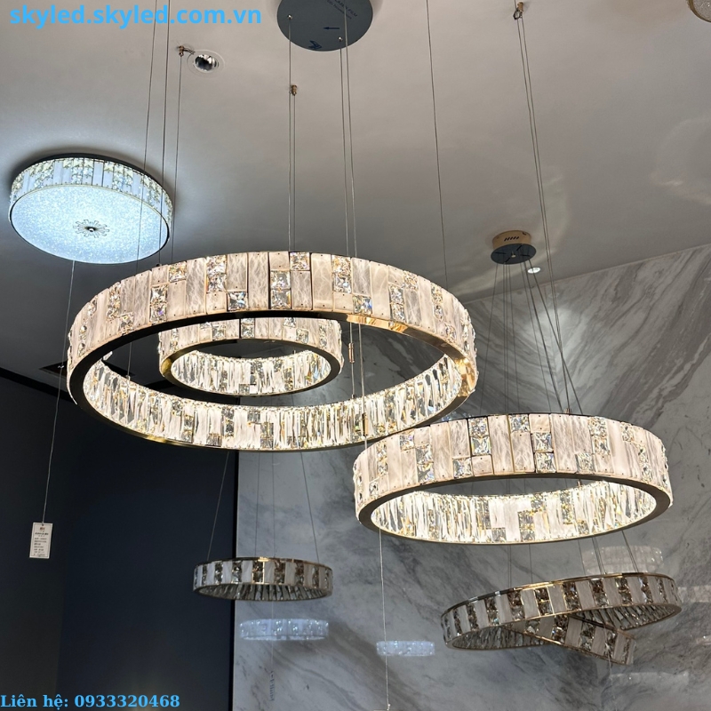 Về chất liệu, đèn thả hiện đại THD876 sử dụng Pha Lê K9 kết hợp với đá cao cấp, mang lại độ bền và tính thẩm mỹ cao. Chất liệu này không chỉ giúp đèn giữ được vẻ ngoài sáng bóng theo thời gian mà còn mang đến khả năng phản xạ ánh sáng tuyệt vời, tạo ra không gian lung linh và huyền ảo. Thiết kế của đèn cũng rất linh hoạt với nhiều kích thước khác nhau như FI800+500, FI480+600+800 và L1000, phù hợp với mọi không gian từ nhỏ đến lớn.
