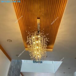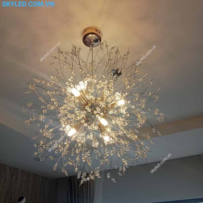 Sự kết hợp giữa kim loại bền bỉ và những hạt pha lê lấp lánh làm tăng thêm vẻ quý phái và sang trọng cho không gian. Đèn thả này không chỉ mang lại ánh sáng mà còn như một món đồ trang trí đắt giá, giúp nâng tầm thẩm mỹ cho bất kỳ không gian nào.