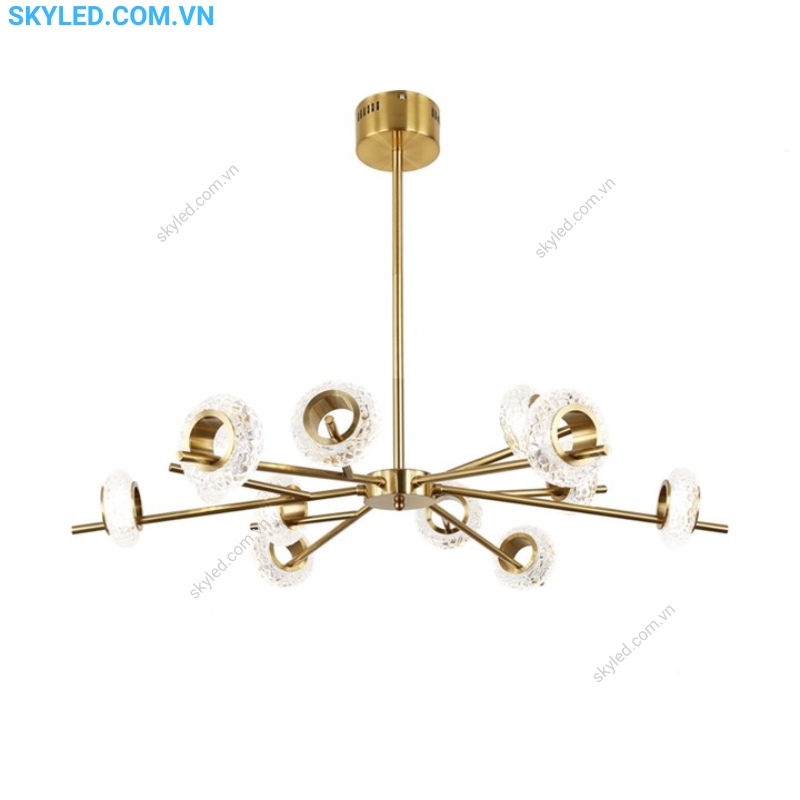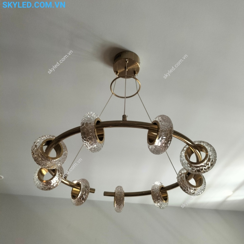 Vật liệu: Thân kim loại xi vàng, kết hợp chao pha lê, mang lại độ bền và vẻ đẹp sang trọng