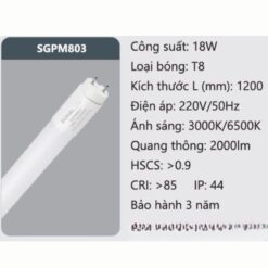 Hệ thống đèn SGPM803 có cấu tạo dạng tuýp tiêu chuẩn T8. Bản vẽ kỹ thuật chi tiết thể hiện: