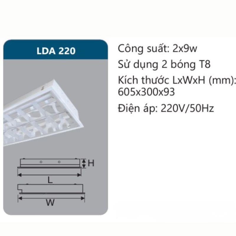 [Hình ảnh: Bản vẽ kỹ thuật mô tả kích thước dài 612mm và cấu tạo mặt cắt của máng đèn LDA220]